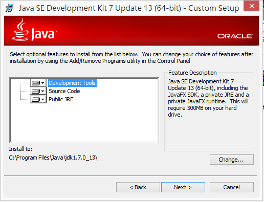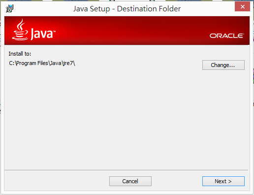 安裝JRE,點「Change...」可以選擇自訂的路徑。並按下右下角的「Next」開始安裝。