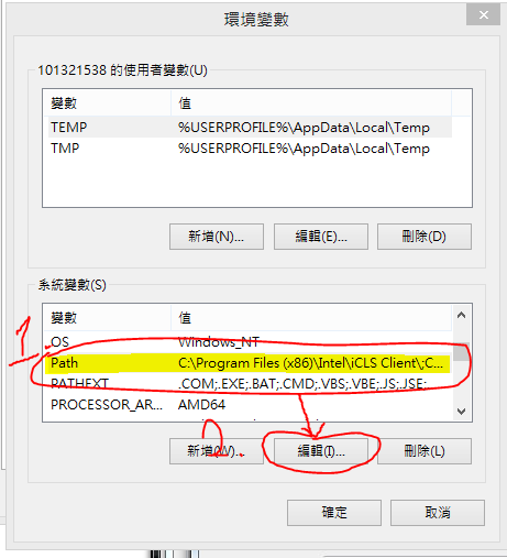 在「系統變數」中選擇變數「Path」,然後按「編輯…」。