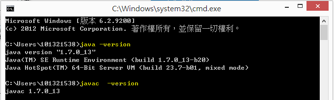 WIN + R,輸入"cmd" 按下Enter鍵,輸入「java -version」和「javac -version」指令,來做測試。