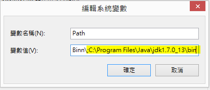 在「變數值」的最後加上JDK的安裝目錄內的bin資料夾路徑預設位置「;C:\Program Files\Java\jdk1.7.0_13\bin」。加路徑前要加上「分號(;)」。
