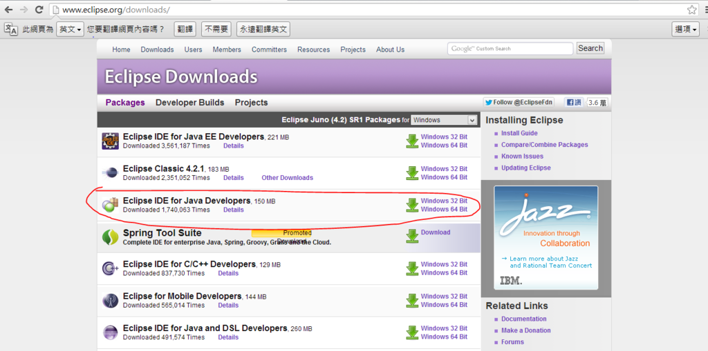 從http://www.eclipse.org/downloads上下載 "Eclipse IDE for Java Developers"