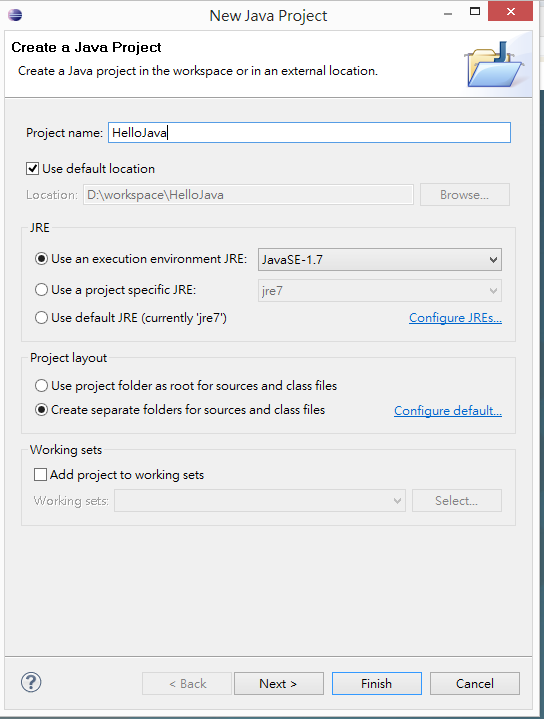 Eclipse都是使用專案「Project」的方式開發Java程式,建立一個新的Java專案。