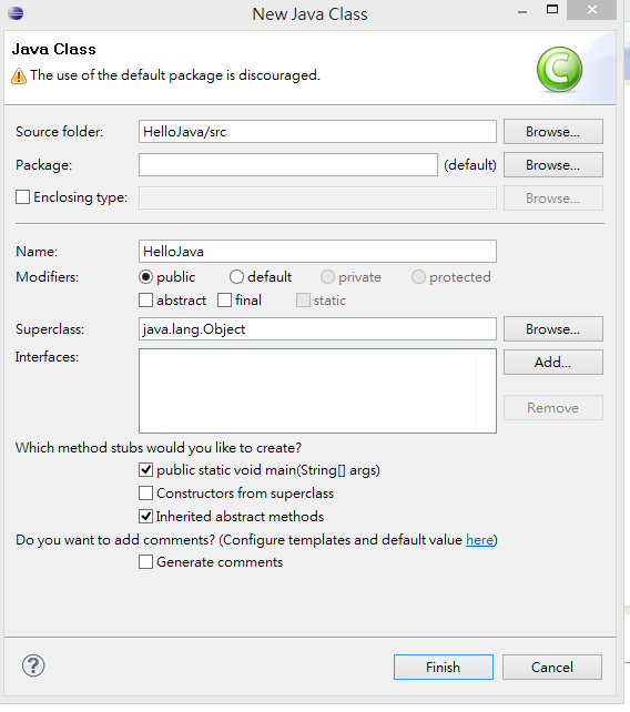 建立專案後,就可以建立Java程式,勾選類別中要有main方法,在新建Java類別視窗輸入所建立的類別(Class)名稱。